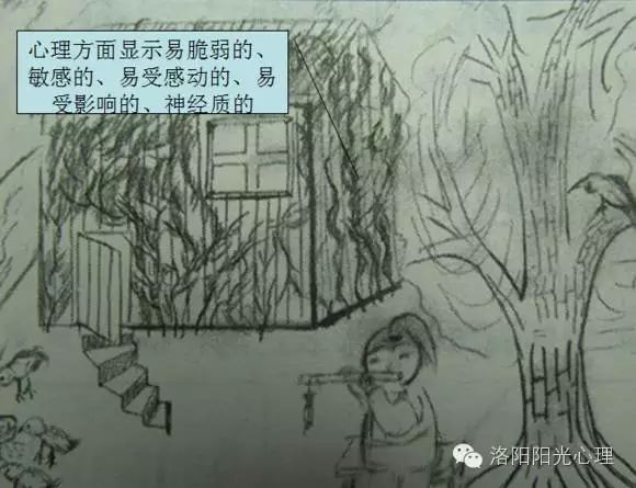 房子周围围绕了许多藤条或者说是爬山虎,线条柔软且纷繁复杂,显示心理方面比较脆弱敏感,易受外界影响。
