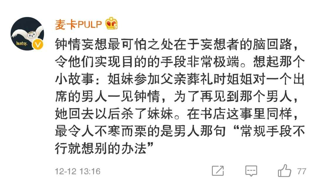 虽然看上去完全没有关系,但这就是钟情妄想典型的脑回路。