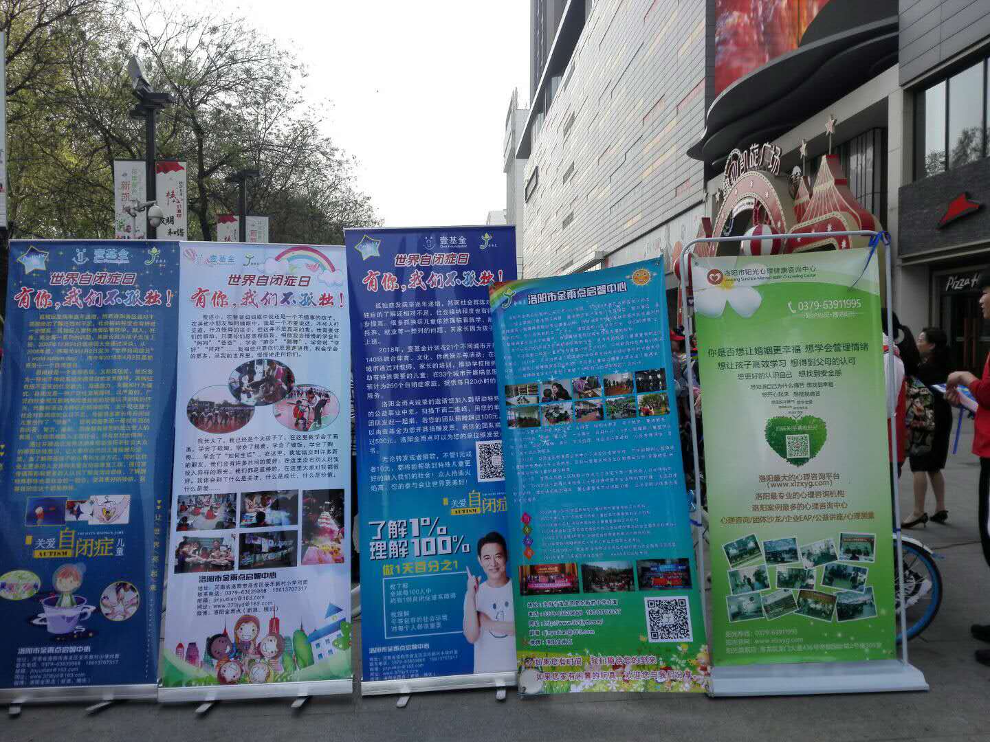 据统计,世界上大约100个人就会有一个自闭症患者。 为了影响更多的人认识了解自闭症,了解到特殊群体也是社会的一部分,使其更好的接纳、包容弱势群体。在洛阳市残联、洛阳市精神残疾人及亲友协会、洛阳市残疾人康复协会、洛龙区残联、洛阳市金雨点启智中心、洛阳阳光心理健康咨询中心的合作下,4月1日上午9:30,在西工区建业凯旋广场举办了“做一天百分之一,有你,我们不孤独”大型公益倡导活动。